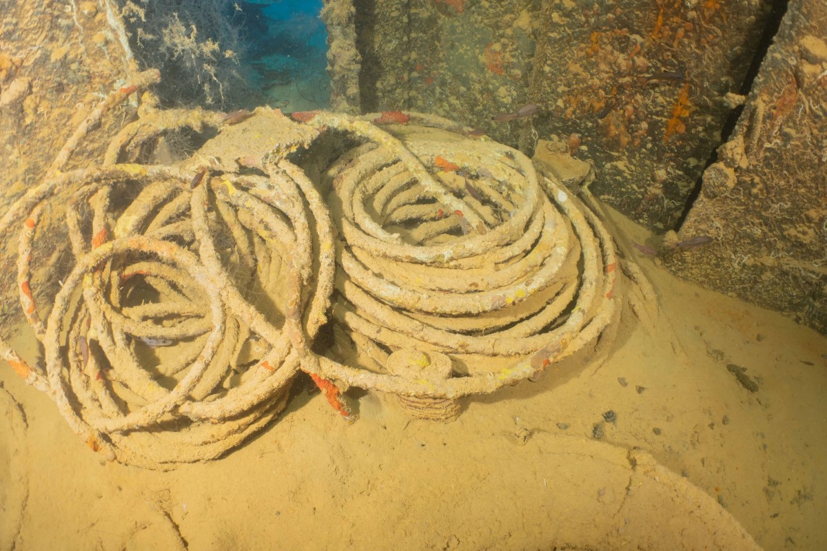 On top of the forecastle is a large double-headed anchor winch and coils of cable now encrusted with colorful corals.