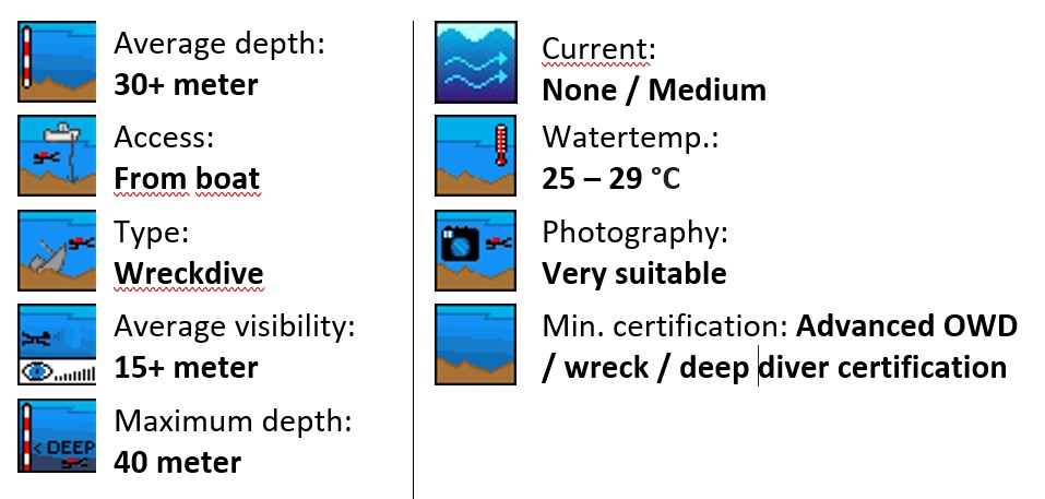 The Chuyo Maru is known as the Lion Fish Wreck for the large number of lionfish that reside in and on the ship. The wreck is resting upright 40 meters of water, with the deck at 30 meters and the top of the forward tower at 12 meters.