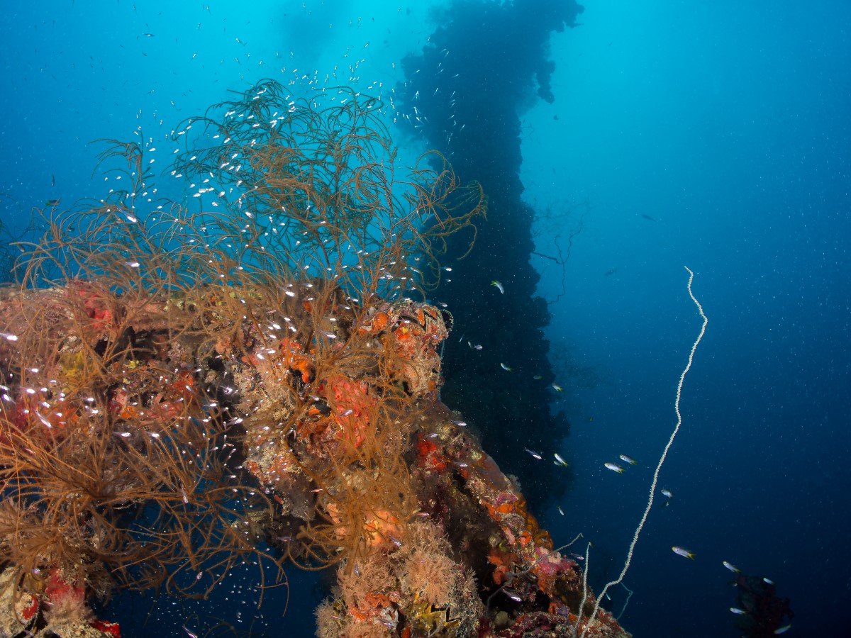 However, the entire bow section is covered with hard corals, black corals (Antipathes sp.), and spiral corals.